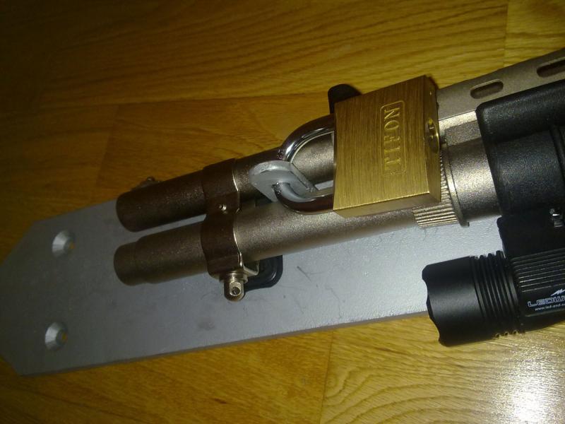 El seguro del guaradmonte, de acero y plástico por el exterior, me vino junto con la escopeta y esta fijado a la base "pletina" soldada, con unos tornillos allen gorditos, asi que es muy resistente a los tirones. El candado superior refuerza el arma al conjunto muy firmemente. Puedes bloquear el arma con el candado solo, con el seguro guardamontes solo y con ambos al mismo tiempo.