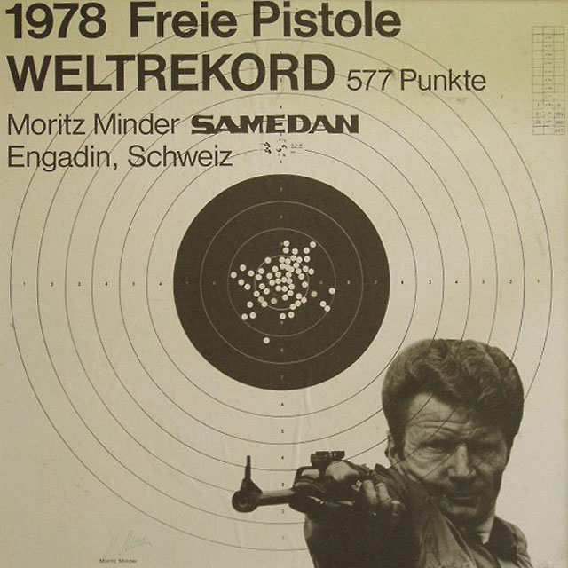 Otra fotografía de un tirador que logró hacer el récord mundial de pistola libre y los impactos que consiguió sobre la diana. Se trata del suizo Moritz Minder, que en el campeonato del mundo de tiro celebrado en Seúl en 1.978 hizo 577/600 puntos, batiendo el anterior récord mundial y quedando campeón individual (obviamente) y por equipos con su país. El hombre se ve que era un poco "manta", se le fue un 8 un poco bajo. Esta foto la había subido ya anteriormente en otro asunto (muchos seguramente la hayais visto ya)haciendo hicapié en la curiosa forma que tenía este caballero de empuñar el arma. Como veréis tiene la palma de la mano que empuña la pistola mirando casi totalmente hacia arriba y el alza situado sobre el dedo pulgar, parece ser según me dijo un compañero veterano del foro que para bloquear las articulaciones del brazo. No se de que pistola se trataría, pero siendo suizo el tirador supongo que se tratara de un antiguo modelo de Hammerli con la empuñadura modificada para poder tirar de esta manera tan extraña, que sin embargo a él tan bien le funcionaba.