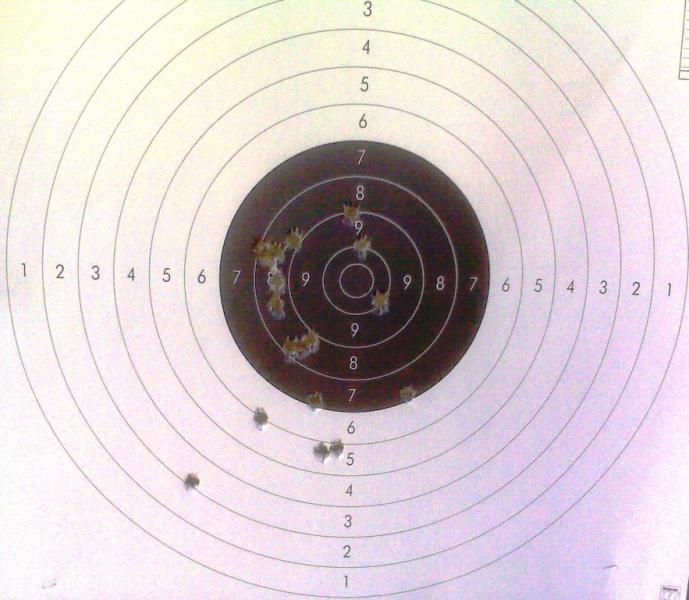 Bien, hoy en compañia de Hector he conseguido la carga feten, eso creo, para esta maravilla de revolver. En el blanco aparecen tres tambores. El primero, de seis tiros, se ha tirado apuntando a base de negro, el primer tiro es el de la izquierda los otros cinco son los que hay alrededor de la base del negro. Luego se tira un tambor de 5 tiros (metí una carga sin polvora) y finalmente un tambor de 6 de confirmación de la carga. Estos dos ultimos tambores se han tirado apuntando a centro.