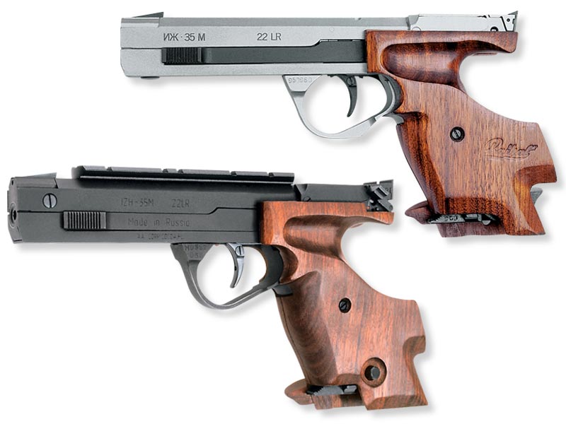 Baikal IZH-35M Matchpistool: Pistola rusa procedente del arsenal ruso de Izhvesk (de ahí lo de IZH). Gatillo totalmente regulable con presión y recorrido variables. Capacidad de cargador de 5 o 10 cartuchos. Dimensiones 300 mm largo x 150 mm alto x 50 mm ancho. Algo pesada (algunos lo consideran beneficioso, si puedes bien con ello), unos 1.400 gramos. Cañón de 153 mm de largo, la longitud máxima permitida por el reglamento ISSF. Tiene un seguro automático de aguja percutora. Concepción de fabricación rusa, nada de superficies pulidas a la perfección ni otras concesiones estéticas, como el resto de armas rusas. Posiblemente tan buena como cualquiera de las otras pistolas deportivas del .22 LR mucho más caras de otras marcas. Las tiradoras rusas la utilizan mucho con excelentes resultados. En la final de pistola mujeres de la Copa del Mundo de Tiro de Sidney 2.010 celebrada el mes pasado dos jóvenes tiradoras rusas entraron en la final con esta arma, puedes ver el vídeo en la web de la ISSF. También puedes ver un video de tiradoras rusas con esta arma en la sección de "recarga y munición", en un post que he abierto consultando si alguien sabe que puede ser lo que la tiradora rusa Svetlana Smirnova, que precisamente tira con este modelo de arma, le echa al último cartucho de su cargador antes de tirar cada serie.