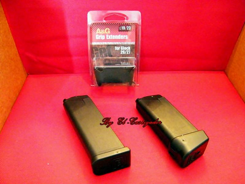 En las siguientes fotos vamos a ver el cargador original más el acople mas 2 que hace que se haga un poco más largo el cargador y el cargador de una glock 19 con el acople para una 26 ( y para una 27 )este es el ideal para los que tenemos la mano grande en la caja del acople se puede ver arriba para que cargadores es G19/23 y valido para adaptar al armazón de una G26/27.