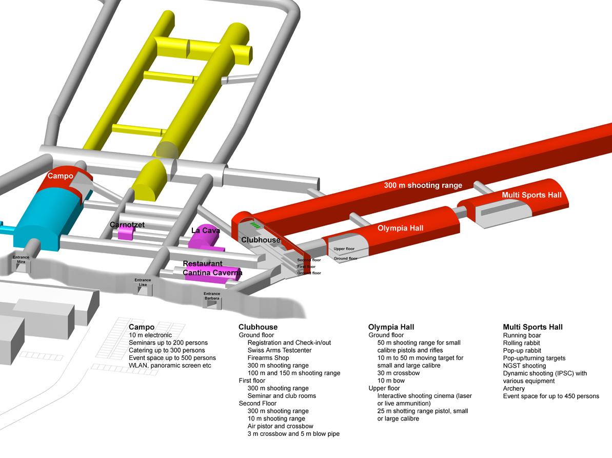Esta galería del tunel es de las pocas que hay en Suiza privada, la construyó y mantiene una empresa especializada en la construcción de tuneles, de hecho adema´s de galerías de tiro, aulas, restaurante, armería, etc. dispone de otros tuneles como por ejemplo hacer pruebas relacionadas con dichas construcciones y pruebas de seguridad de cualquier tipo (incendios, rescates, aviación, etc.). Creo recordar de tiro había: