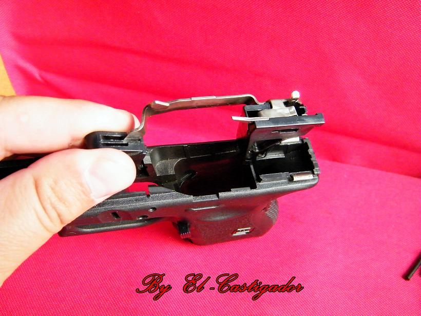 En la siguiente foto veremos como podemos quitar la pieza del bloqueo de la corredera al armazón, es muy sencillo hacemos presión desde arriba y por un lateral la empujamos para que salga por el otro lado, igual da izquierda que derecha, por cierto no cuando la quitais no salta nada ya que el resorte que la obliga verticalmente es una lamina que está anclada al armazón y no se cae si no la sacas ya que está bien cojida.