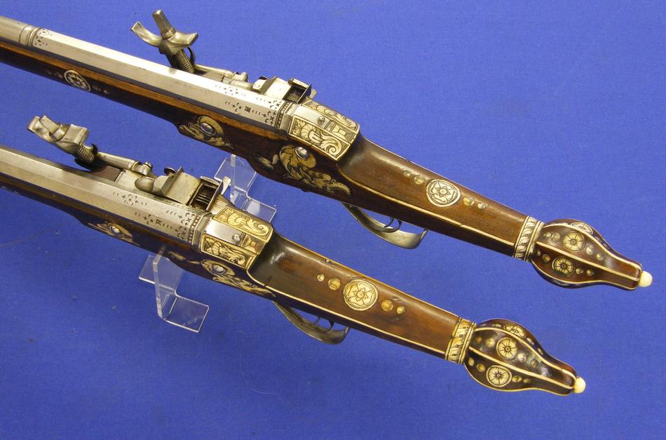The locks are fine engraved and chiselled with gold inlay. The silver parts are also partly gilded. Signatur in silver on the barrels.