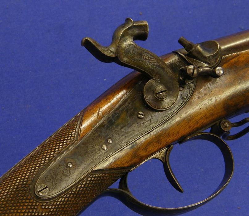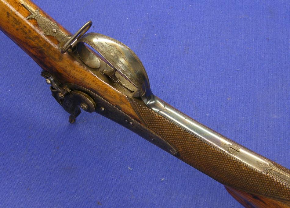 Un bonito rifle de percusion aleman por el señor Tanner de Hannover, en calibre de 15 mm y largo de 122 cm. En impecable condicion. Las partes de acero estan grabadas con escenas de caza. Su precio es de 2.900 euros.