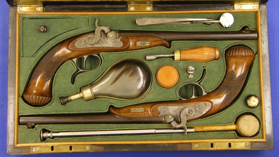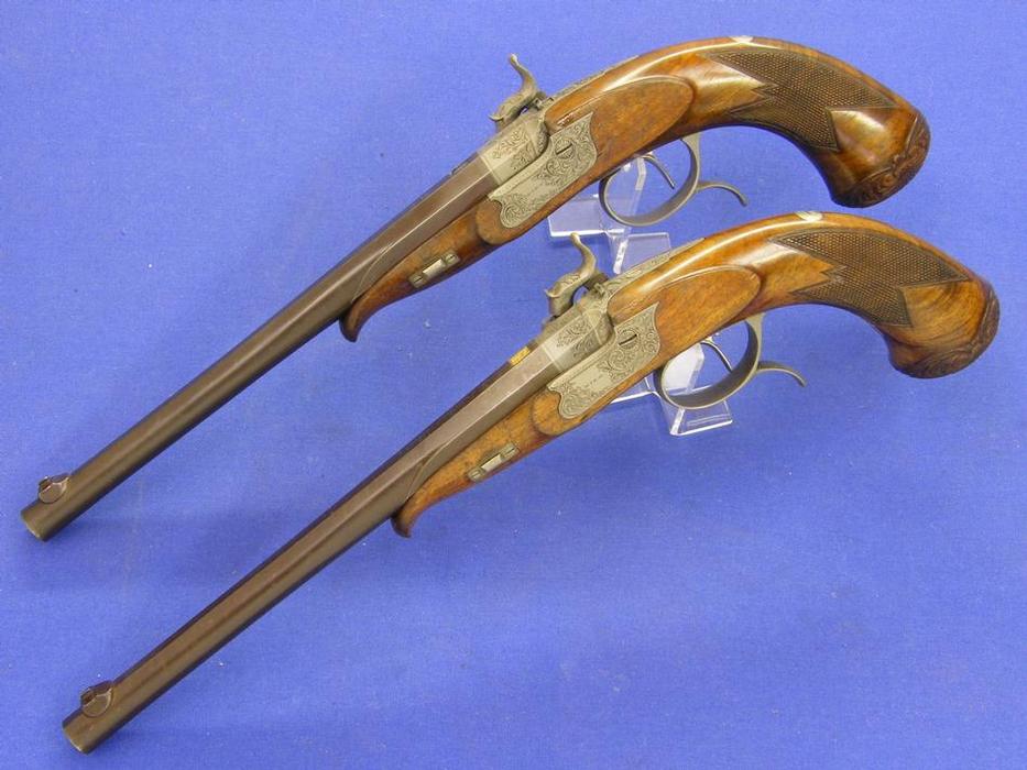 The pistols have set-triggers. Barrels original brown. Iron parts original grey.