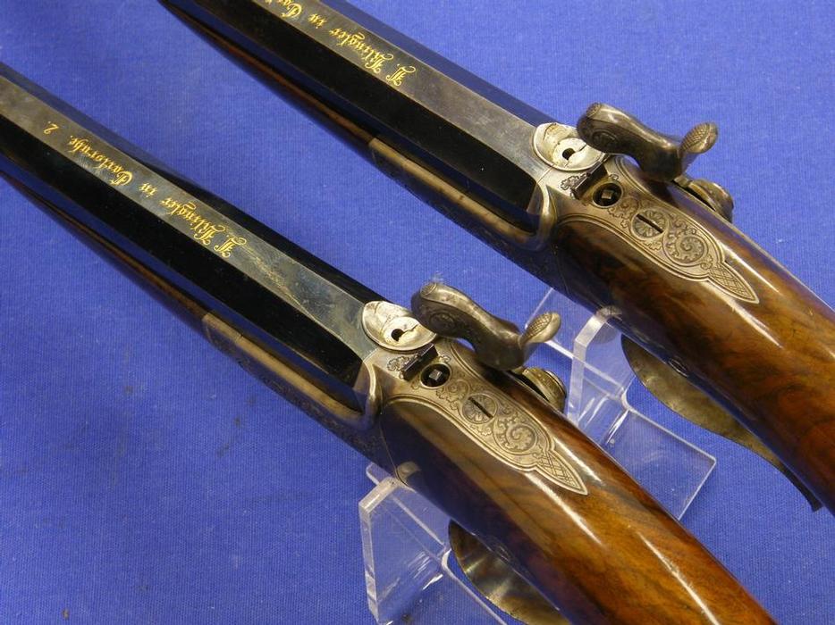 A superb cased pair 19th century German Pinfire Pistols by J.KLINGLER IN CARLSRUHE, caliber 10 mm, length 38 cm, in mint condition