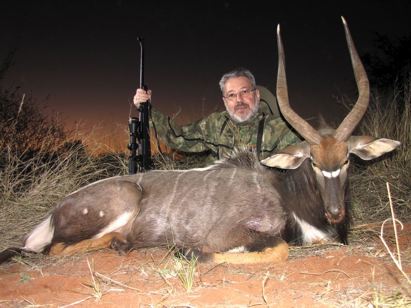 Fuimos a una zona de la finca donde suelen estar, con bastante vegetación, matorrales y acacias. Dejamos pasar algunos que no le parecieron buenos al PH, estábamos de vuelta al 4x4 ya que estaba anocheciendo, cuando vimos a este ejemplar, quieto entre los árboles, supongo que estaba convencido de que era invisible para nosotros, con su perfecto camuflaje. El PH me susurra, es bueno, pero tienes que asegurar bien el tiro, con lo que queda de luz, no podremos pistearle. Le disparo a una distancia de unos 50 mts, y le alcanzo en el corazón, se quedó en el sitio.