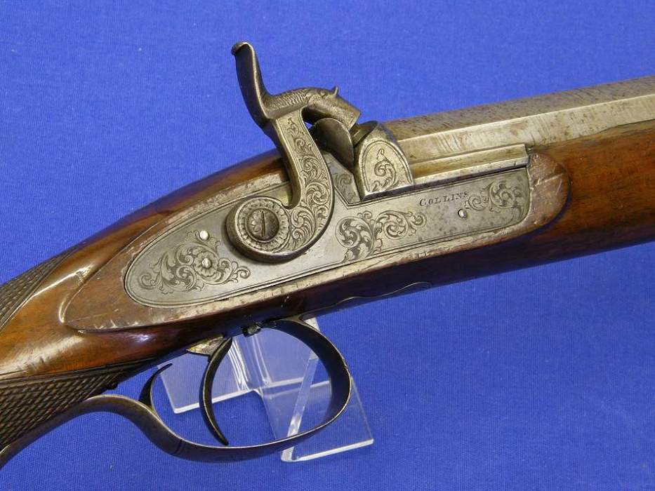 Este finisimo rifle ingles de gran calibre por Collins de Regentstreet de Londres, calibre 18 mm. longitud 120 cm. con restos del original pavon azul y cañon de damasco.