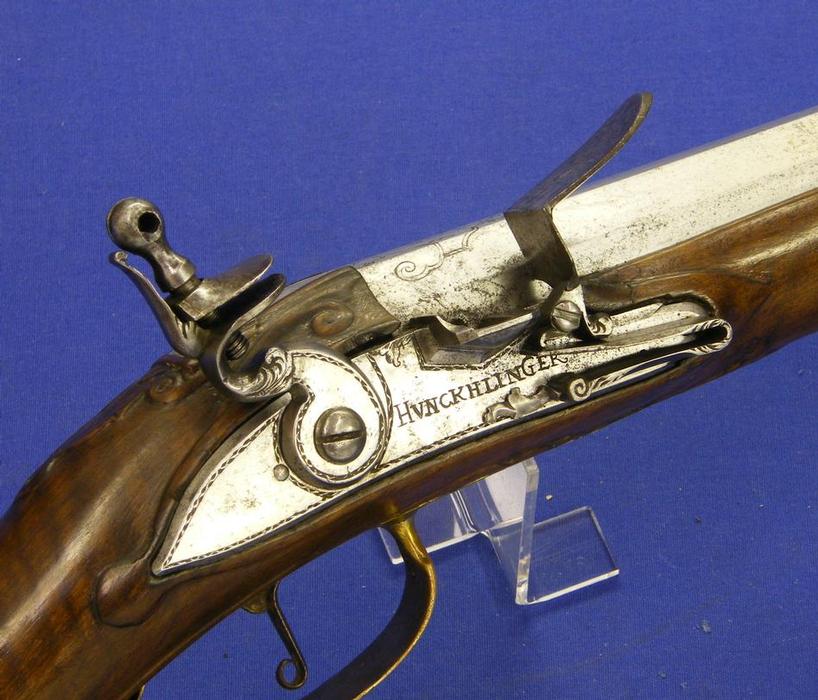 Un trabuco de silex aleman, muy bonito, firmado por HUNCKHLINGER, sobre 1730, longitud de 98 cm. en muy buen estado.