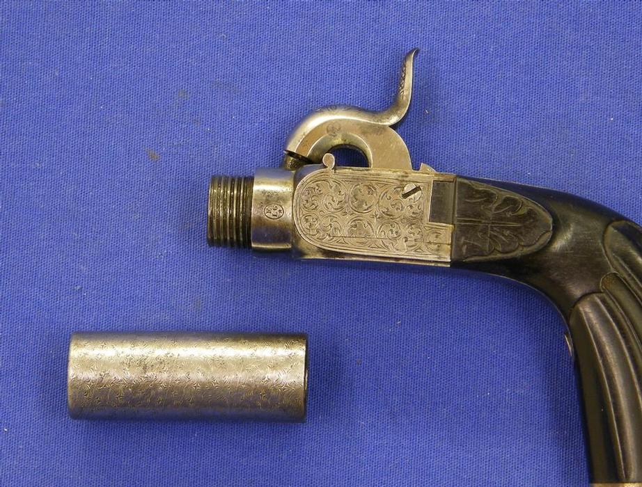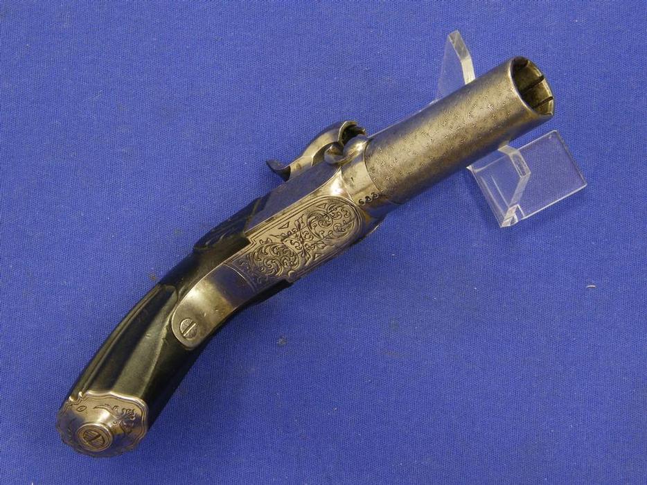 A very nice made 19th century Liege Percussion Pocketpistol, fine damast barrel, caliber 17 mm, length 18 cm, in mint condition