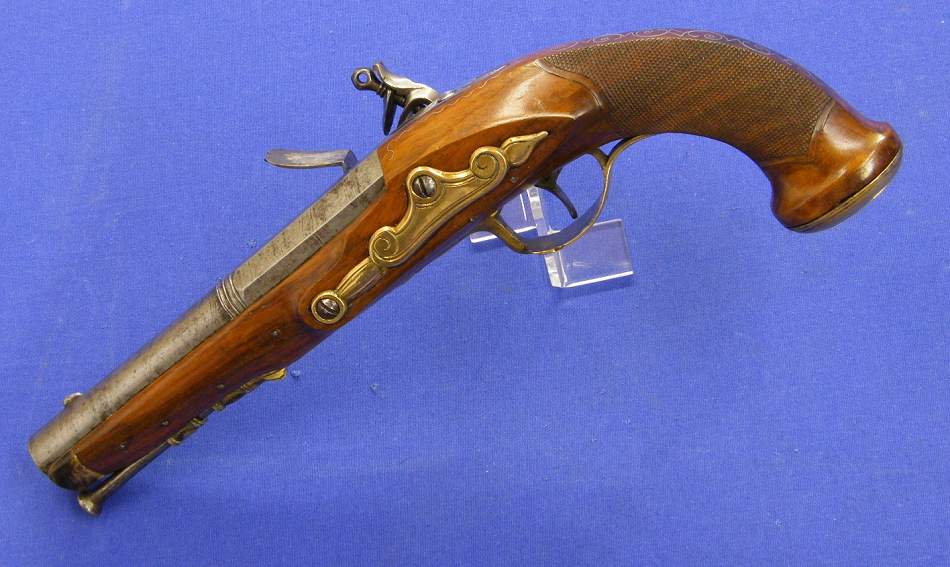Preciosa pistola francesa de silex del siglo XVIII cañon en damasco y aparejos en bronce, calibre 14 mm. largo 32 cm. en ideal estado.