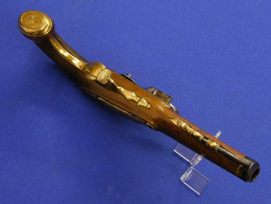 Un raro ejemplar de pistola/trabuco de silex del siglo XVII, probablemente Holandesa, longitud 29 cm. en muy buen estado.