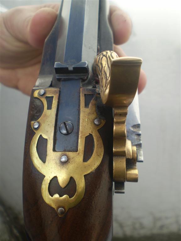 La pistola Catalana es calibre .50, tambien se pueden hacer en el calibre que deseen. En calibre .50 estamos usando una carga de 25 grains de la polvora que hay en este pais que es marca Inkael, varia mucho con las polvoras que usan ustedes alla. El origen es: pistola Catalana