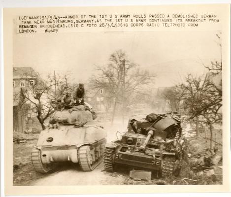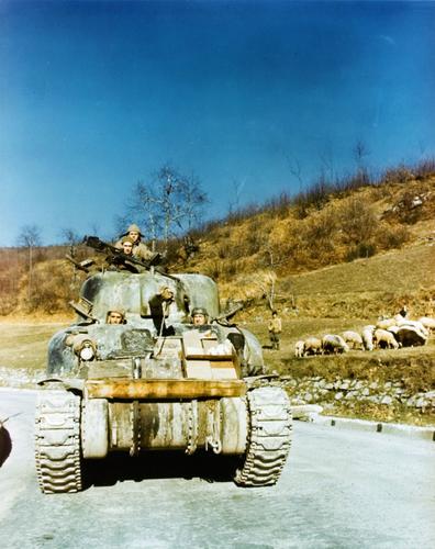 este esta preparado para operaciones anfibias..se adivina, bajo la lona que cubre el frontal de la torre, el otro modelo de escudo, mas ancho, que cubre desde el telescopio de punteria del tirador hasta la ametralladora coaxial..en fotos posteriores vereis ese escudo con claridad......y fijaros en las extensiones para entrada de aire y salida de los escapes del motor....ah!! y es una buena foto para apreciar el frontal de las escotillas del conductor y ametrallador...en este caso disponian de un visor frontal...en sherman early de produccion mas tardia, estas "ventanas" desaparecen..en la primera res`puesta de este tema, teneis un perfil en el que se aprecia esa ausencia de las "ventanas".