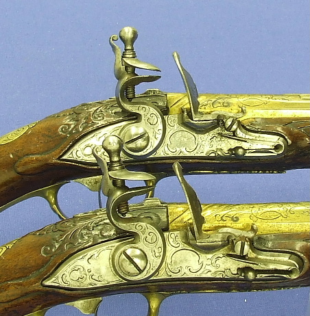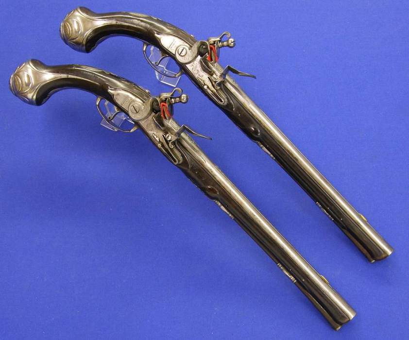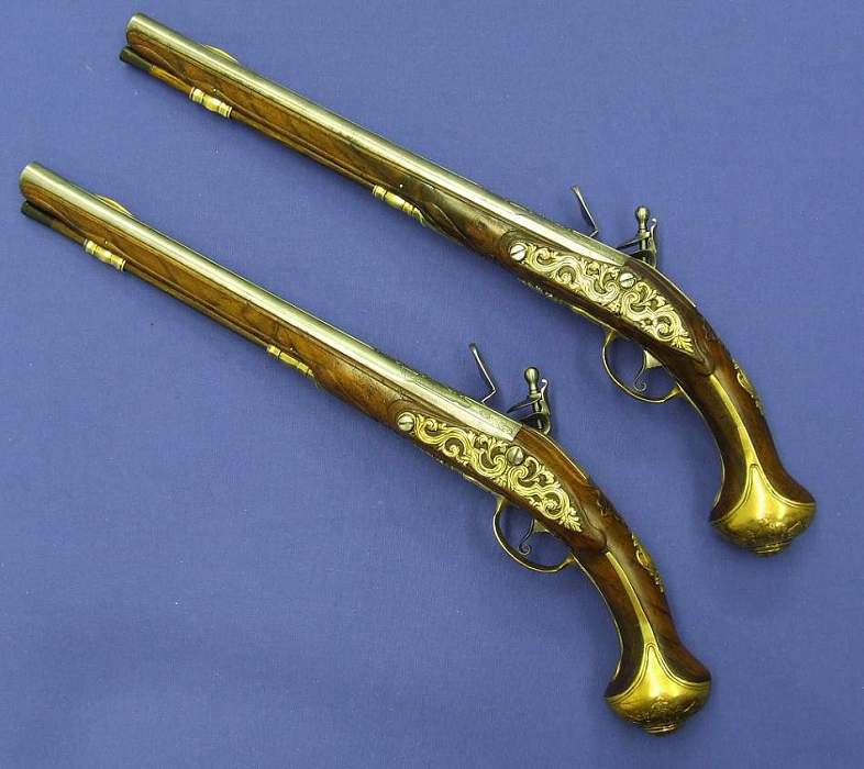 Soberbio par de pistolas holandesas de silex, sin firmar pero indudablemente de Maastricht, con cañones labrados calibre 15/16 mm (osea 15.5 mm de media