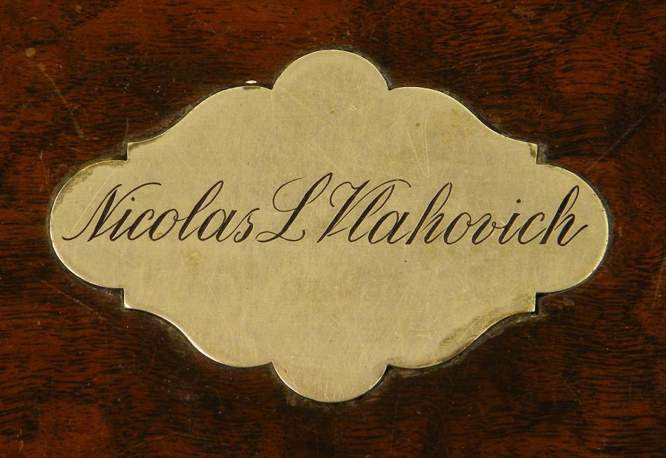 En la placa de plata del estuche el nombre del propietario Nicolas L. Vlahovichque fue presidente del Boca Junior en 1928/1929, en este club jugo, años despues, Diego A. Maradona.