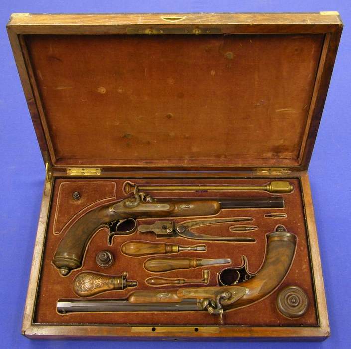 Un bello estuche con una preciosa pareja de pistolas de percusion argentinas firmadas por L. Ambrosini de Buenos Aires en perfecto estado y sin usar, (hay gente pa'todo). Las pistolas tienen miras ajustables. Las partes de acero finamente labradas y con su pavon (creo entender) original. Sobre el azul de los cañones en oro el nombre del fabricante.