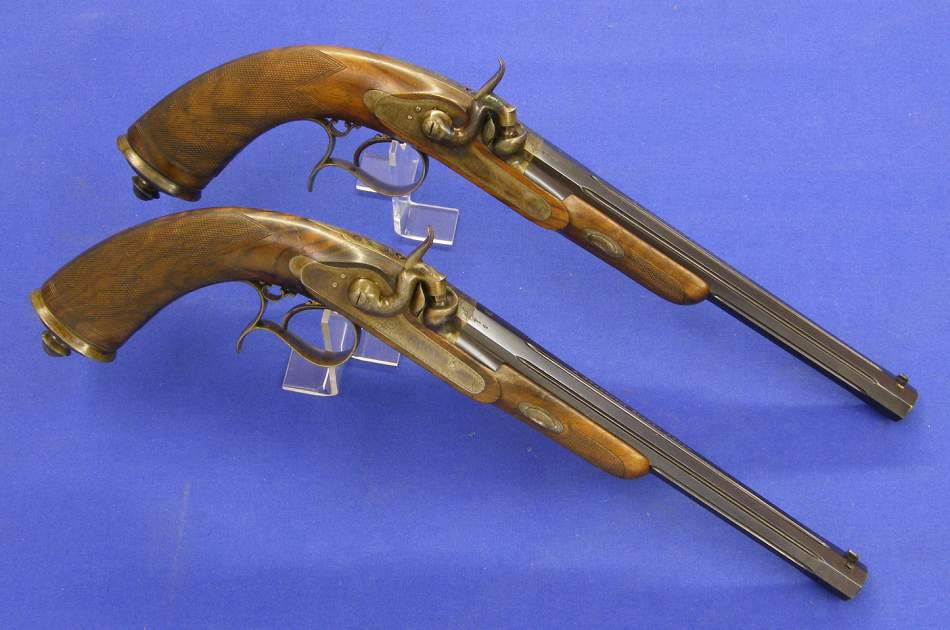 The pistols are in unused condition. The pistols have adjustible sights. The iron parts are veri fine engraved and with original case hardening. The blue barrels are in gold signed with the makers name.