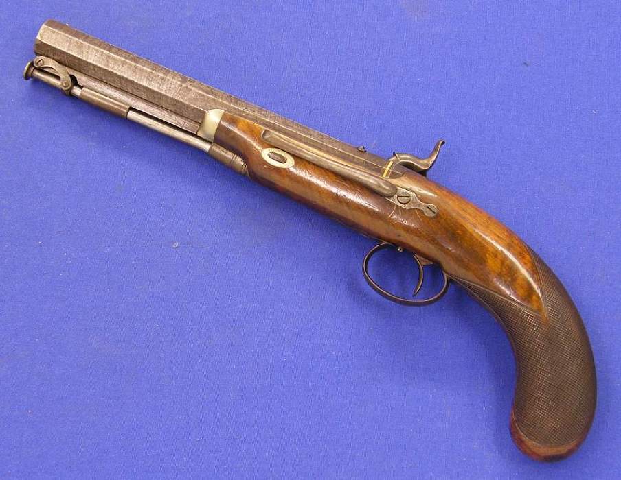 Preciosa pistola inglesa de percusion, sobre 1860 por Manton de Londres, calibre 16 mm. longitud de 38 cm. en muy buen estado.