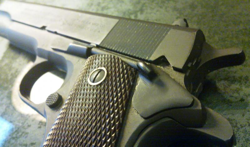 Así que ahí van algunas de mi Colt 1911 A1, fabricada para la US Army en 1.943. Por cierto, el único punzón de banco de pruebas que lleva es el de EEUU. La compré en Alemania, por lo que supongo (repito, supongo) pudiera ser alguna de las capturadas a los USA durante la II G. Mundial.