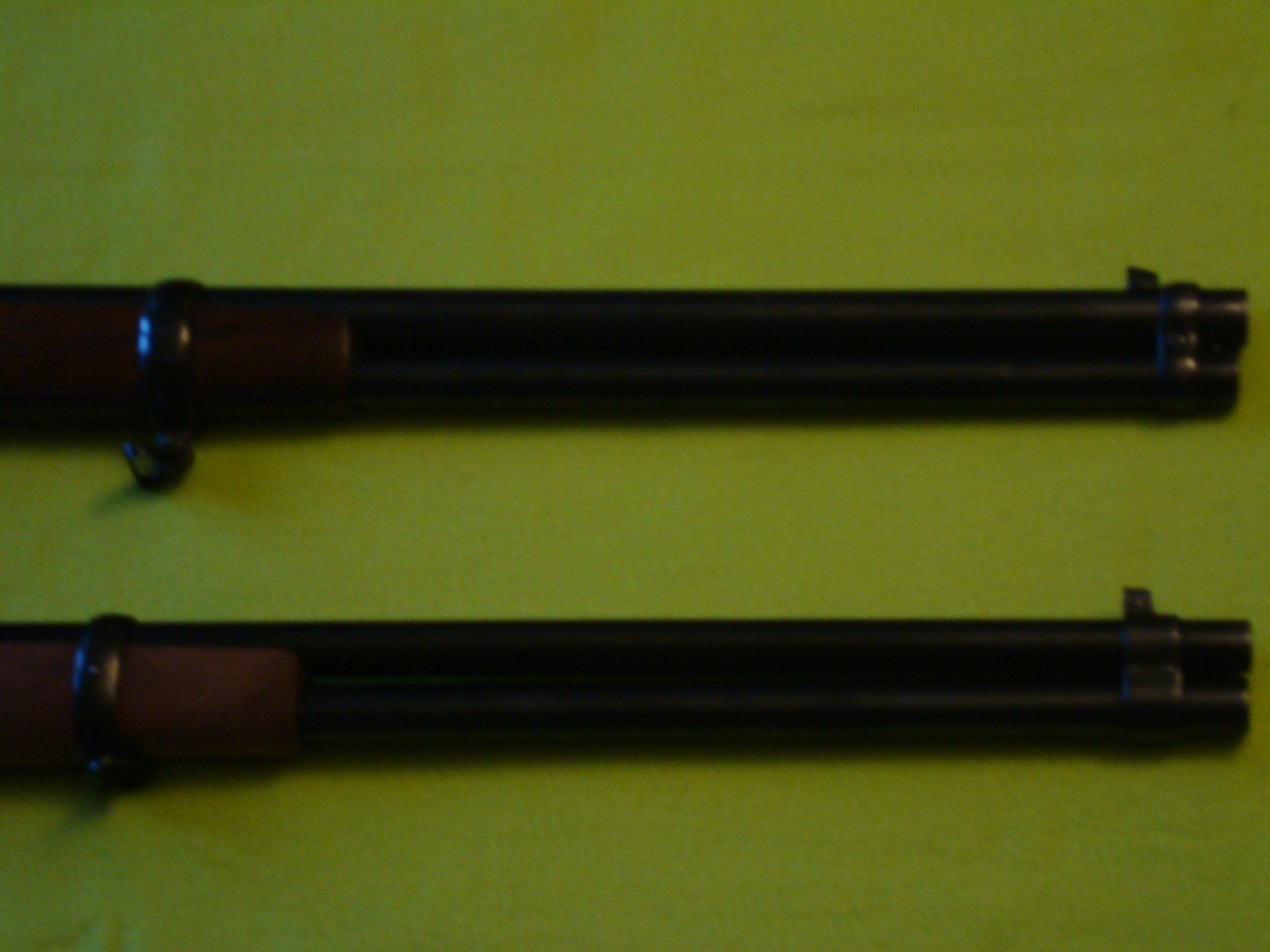 Los cañones son practicamente iguales delongitud, en la corta es 5 mm mas corto desde la boca de la recamara a la boca de salida del pryectil. Puestas una al lado de la otra se nota la diferencia.
