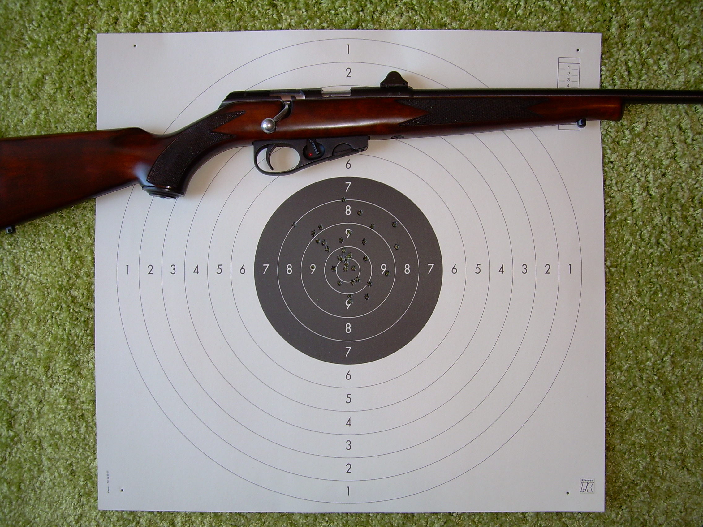 Estoy acabando de ajustar las miras de la carabina. Pongo una foto de la última diana con miras abiertas a 50 M. Me falta bajar un pelín el tiro porque sale ligeramente alto, pero ya estoy contento con el resultado teniendo en cuenta que tiro muy pocas veces y soy bastante malo.