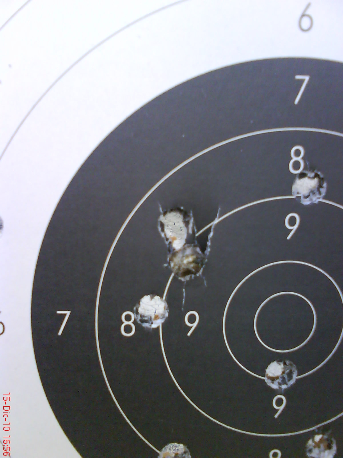 Hola, ya mande los resultados, me paso una cosa curiosa, cuando llevaba 3 tiros, miro por el catalejo, y veo 4 impactos :!: , digo, habre contado mal, repaso los tubos llenos, los vacios, todo cuadra 3 vacios, 9 llenos, ¿que ha pasado?, sigo tirando y al terminar e ir a tomar la foto, me encuentro un taco de papel, incrustado en el 9 :shock: :shock: :shock: , por supuesto no atravesó la madera, ¿le a ocurrido esto a alguien alguna vez?