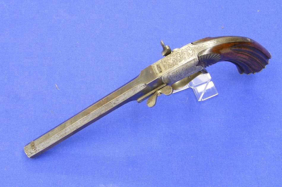 Bella pistola belga de percusion para tiro de salon, calibre 6 mm. longitud de 33 cm, marcas del banco de pruebas de Lieja (ELG) en perfecto estado.
