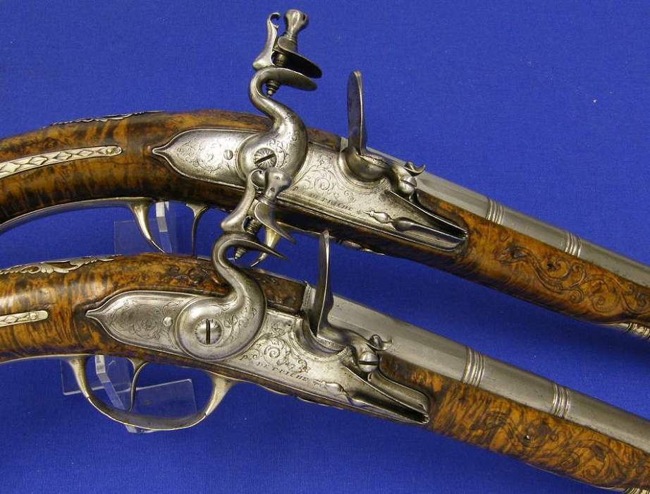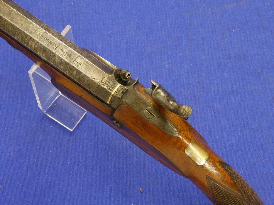 Preciosa pistola inglesa de dos cañones y llaves de chispa por Hulbert (Screwsbury) calibre de 15 mm, longitud 31 cm. en muy buen estado.