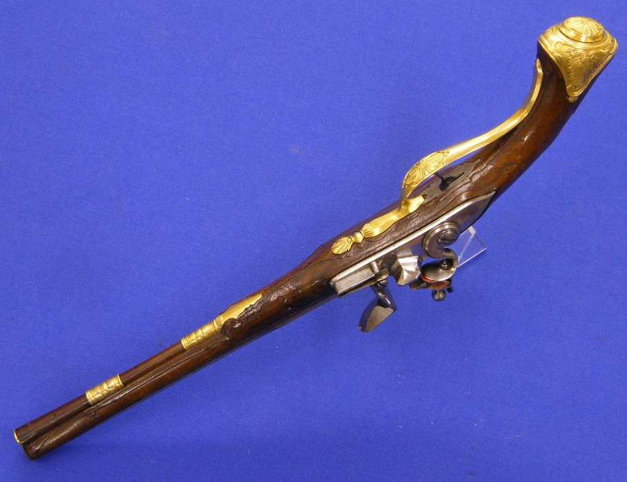 A very fine high quality German flintlockpistol with gilded mounts, length 43 cm, small caliber 14 mm, Provenance Schloss Ettersburg, in mint condition