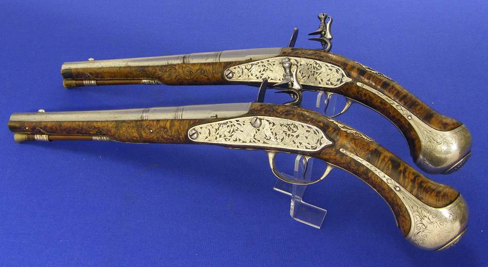 A very nice pair of 17th century silver mounted Liege pistols by Detriche, in mint condition .
