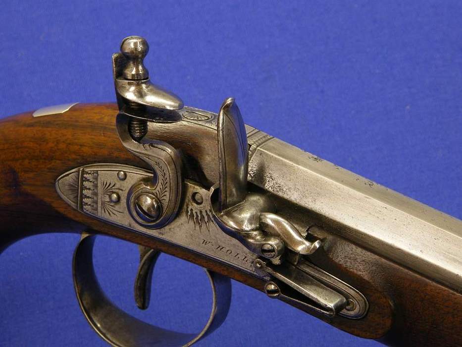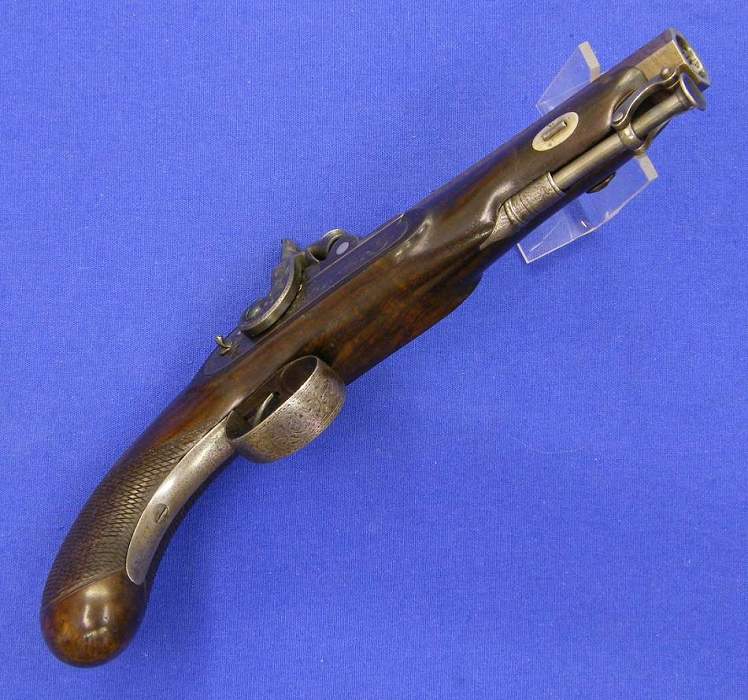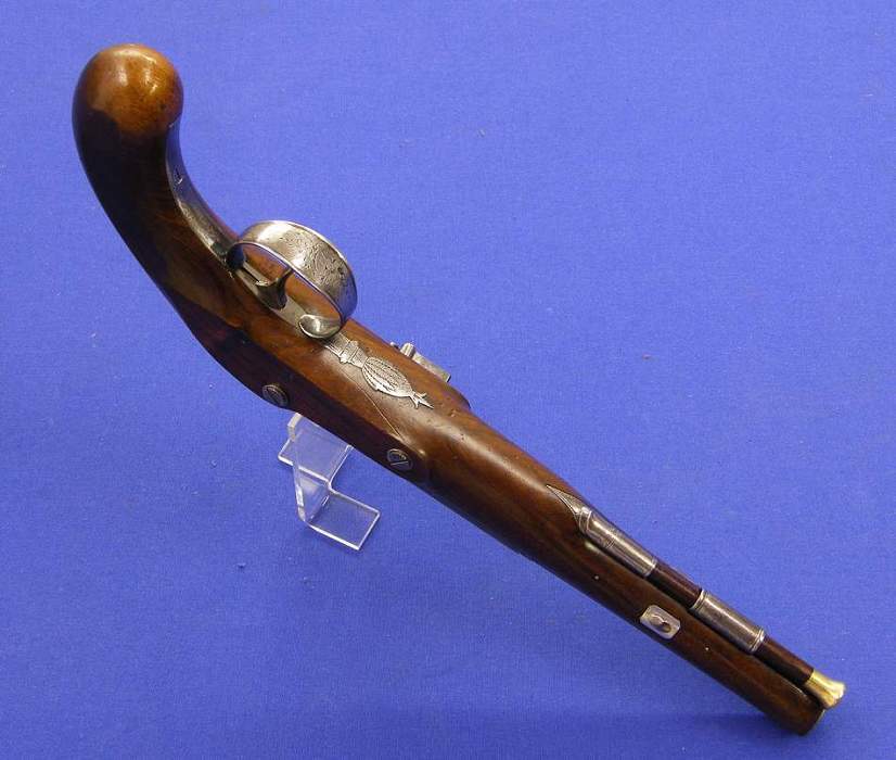 Preciosa pistola inglesa de silex por W. Hollis de Birmingham sobre el año 1800, calibre 17 mm, longitud 39 cm. En perfecto estado.