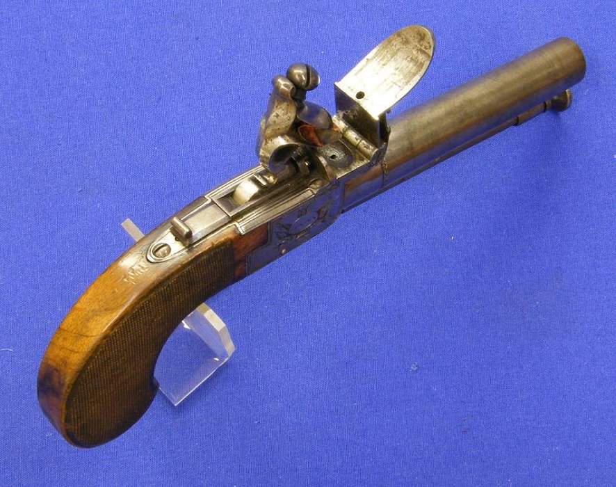 Una bella y de alta calidad pistola de silex inglesa de bolsillo fabricada por P. Bond de Londres, sobre el año 1800, calibre 13 mm. Longitud 22,5 cm. En perfecto estado,