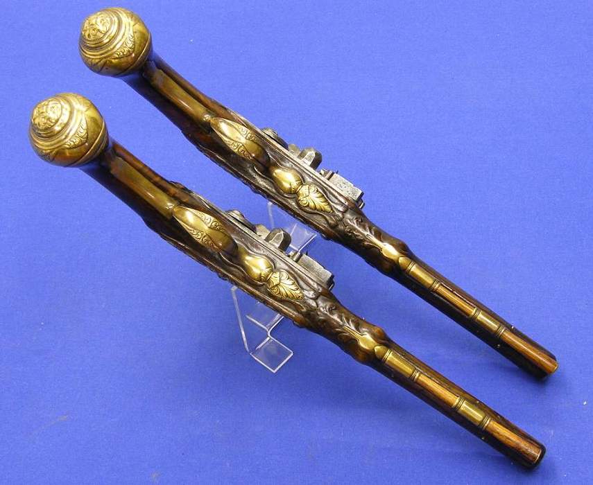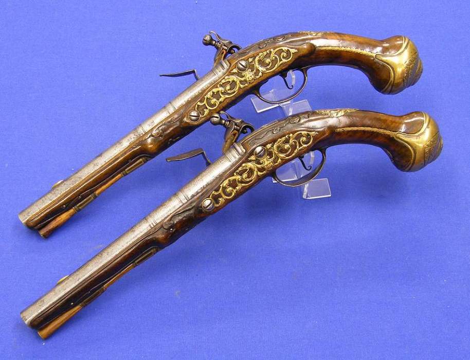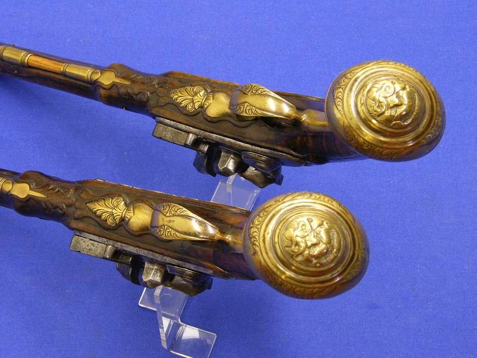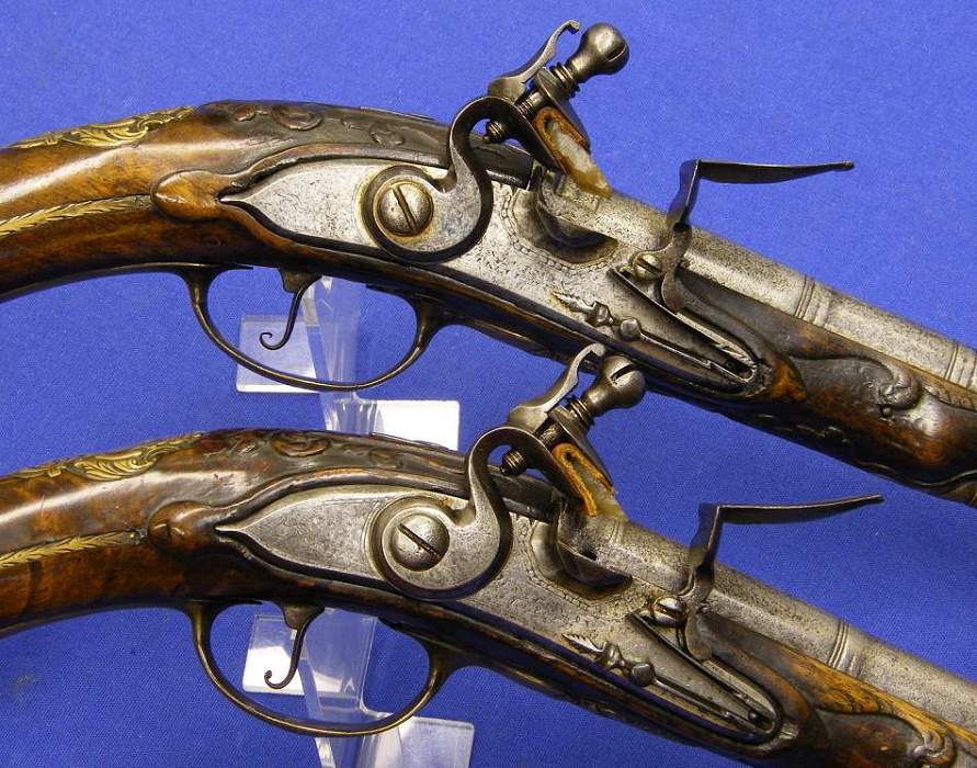 Bella pareja de pistolas holandesas de silex por Penterman de Utrecht, sobre 1720, longitud de 42 cm. Calibre 16 mm. En muy buen estado,