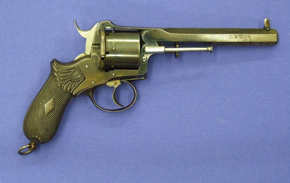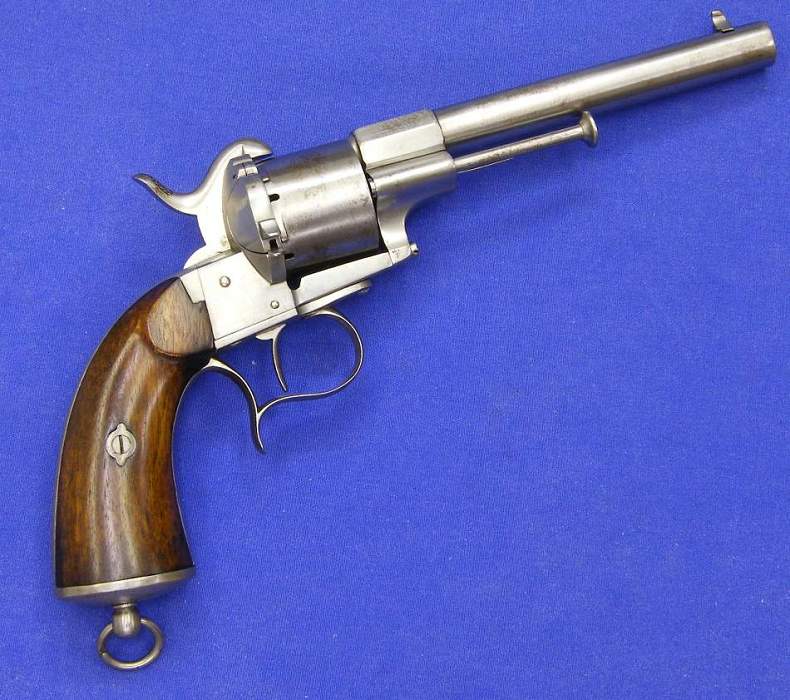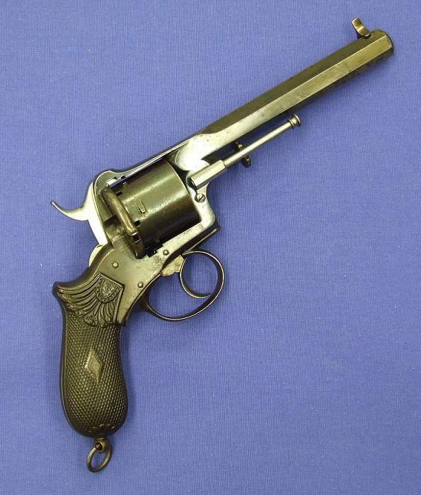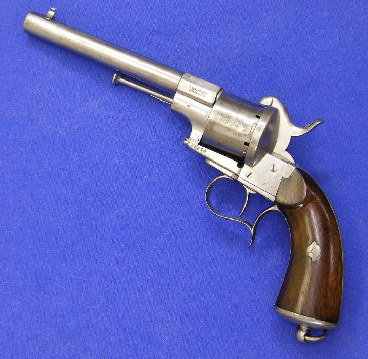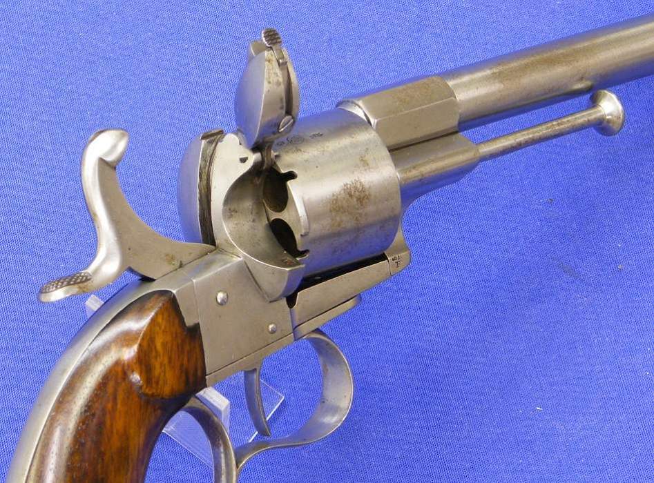 Revolver de sistema pinfire marcado E. Lefaucheuax Brevete, calibre 11 mm. Longitud 32 cm. En muy buen estado. Precio 1250 euros