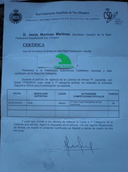 Adjunto fotografía del certificado que me ha hecho la ESPAÑOLA, de que puedo pasar a tirador de 1ª con la modalidad de Armas Historías de Cartucho metálico.