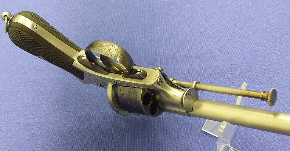 A very scarce Dutch pinfire revolver, signed on the frame MEYERS BREVETTE and on the top of the frame P.STEVENS MAASTRICHT in mint condition, lenght 30 cm, call.11mm. Price 2.100 euro