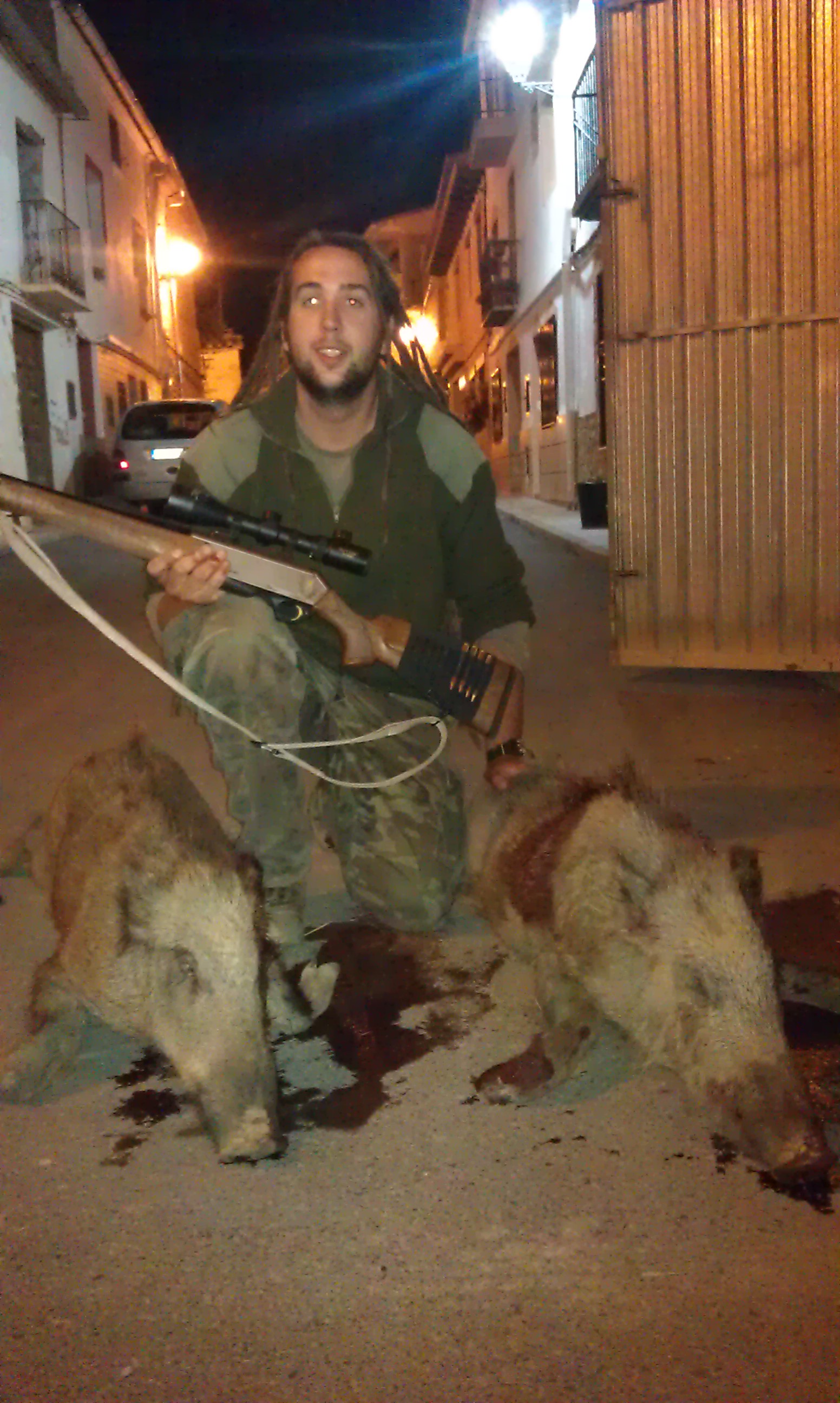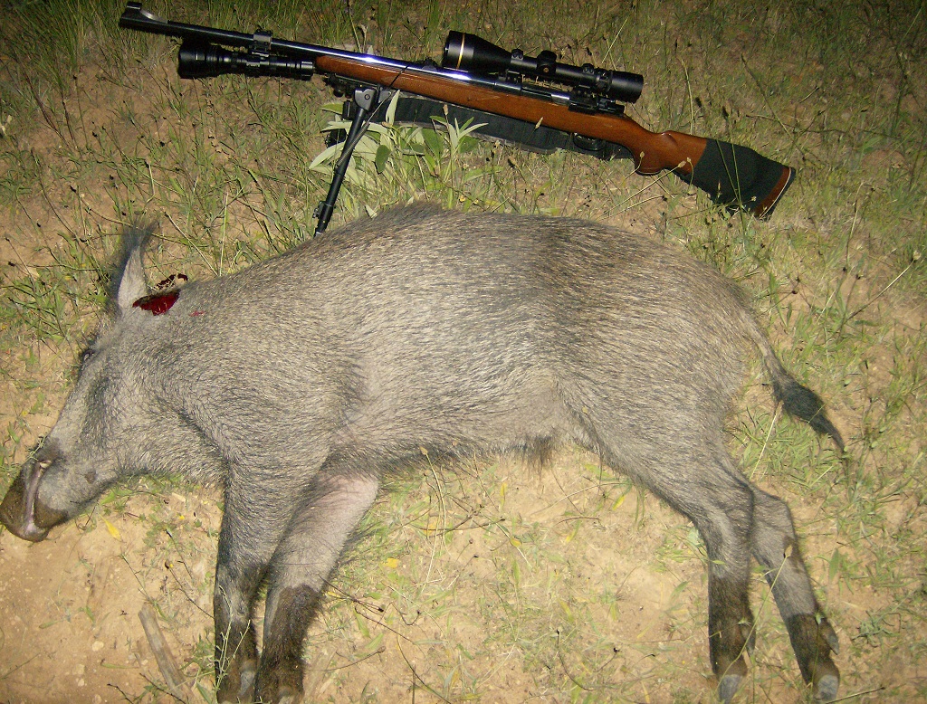 Como sabia que todos bajarían al trigo los fui dejando cumplir y decidí que dejaría pasar los primeros por estar casi seguro que serian hembras y así lo hice, llegaron los dos primero al trigo y los perdí de vista, tras estos entraron otros tres los cuales por la altura del trigo también perdí de vista, y entonces decidí que el próximo que bajara el ribazo hacia el trigo seria al que disparara me encare el rifle y con la poca luz que había ya que eran las 22:30 pasadas encare y de inmediato vi bajar uno el ribazo y se metió de lleno en mi visor, le coloque la cruz en la paletilla y dispare PUMM un estruendo recorrió todo el monte y todos los jabalís comenzaron su estampida, veo por el visor como sale polvo tras el jabalí y pienso que lo he fallado, e inmediatamente enciendo al luz y empiezo a buscar otro en el bancal de arriba, y nada mas enfoco a uno se para en seco y PUMM y este si lo veo caer seco, entonces oigo otro pasar casi por debajo del pino, me encaro lo meto en el visor, y veo que lleva dos rayones a su lado y que ademas va gruñendo llamándolos, lo sigo con el visor y veo que se para en la orilla del monte a unos 7-10m de mi y empieza a gruñir llamando a su prole, y decido no tirar por que obviamente es puerca.