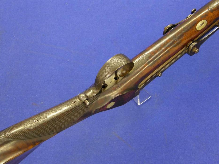 On the original brown barrels in gold COLLETTE A VARSOVIE and CANNONS TORDU. Al the parts very fine engraved. It is a very special system of Needle Fire. Caliber 16 mm, length 118 cm.
