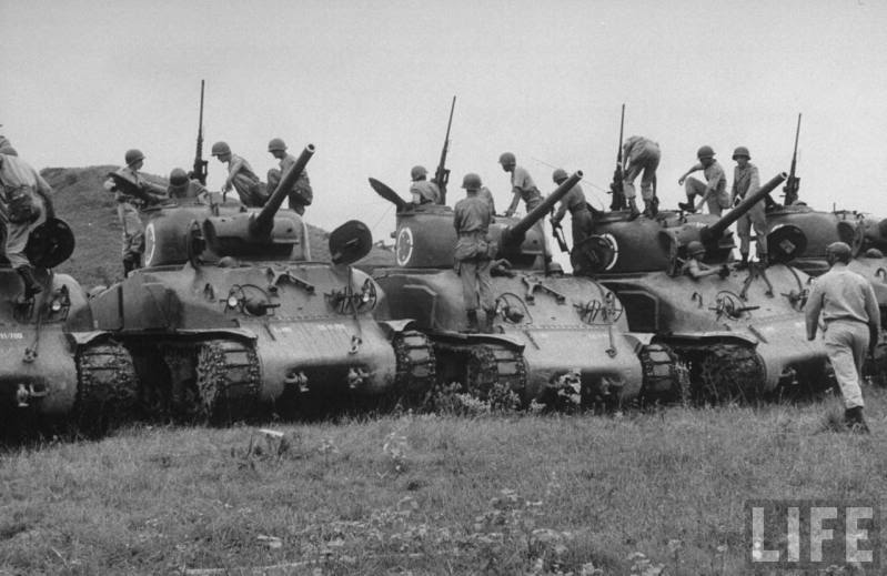 entre los M18 Hellcat, los M5A1 Stuart, los TRV M31 y Sherman M4A3 (76) W con distintos tipo de torre, mas un M4 (105)....se ven un M4 inicial (con escudo de cañon estrecho y visores para conductor y ametrallador) mas o menos al centro...y un M4A1 inicial a la izquierda....supervivientes????
