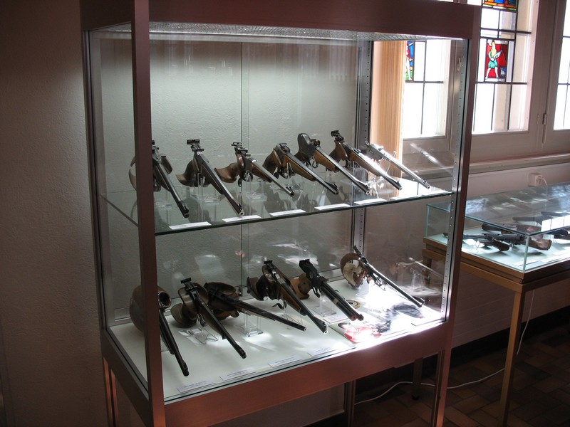 Parece ser (la información sobre estos temas es muy escasa) que Minder habitualmente usaba la MU-55, que creo que es también la que se ve en la imagen que hay de él con el blanco de su récord del mundo, pero el récord lo estableció con la Toz 35 de la vitrina, según los datos del museo suizo de tiro (hay un documento en PDF el que se relacionan los objetos expuestos en el que se detalla hasta el nº de serie de esta Toz 35 y su año de fabricación, luego lo busco y lo pongo). Creo que incluso se expone junto esta Toz 35 modificada por Minder otra sin modificar para que se aprecien mejor los cambios efectuados.