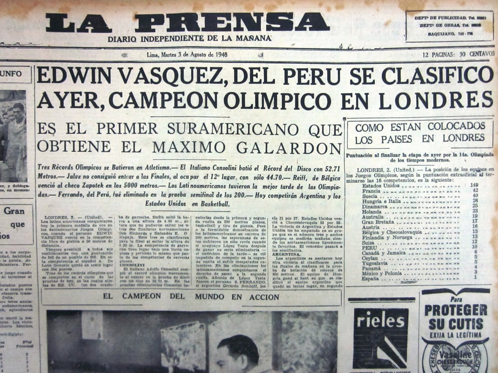 En la prueba de pistola libre de los JJOO de Londres de 1.952 tuvo lugar un acontecimiento que puede considerarse que fue una gran sorpresa para todos. Los favoritos para adjudicarse la victoria eran a priori el sueco Ullman, el suizo Schneyder y el estadounidense Benner, todos ellos grandes y reconocidos tiradores a nivel mundial que habían logrado anteriormente multitud de éxitos. En los días previos a la competición llamó la atención de los presentes, periodistas y participantes de la competición, la presencia de un menudo tirador peruano desconocido para la gran mayoría de ellos, llamado Edwin Vásquez Cam. Parece ser que en los días previos al evento Vásquez estuvo entrenando con gran ahínco al objeto de poder realizar la mejor actuación que le fuera posible. Se da la circunstancia que el arma que utilizó no era suya, sino prestada (no se quien se le prestaría ni el motivo por el cual no tenía consigo la suya). El caso es que el 2 de Agosto de 1.952, en el estadio de Wembley, el bueno de Edwin dió la campanada y logró uno de los mayores éxitos para el deporte de su país, ya que se proclamó contra todo pronóstico campeón olímpico de la modalidad con una puntuación de 545 puntos. Vásquez, fallecido en el año 1.993, sigue siendo a día de hoy el único deportista peruano que ha conseguido un oro olímpico, así como el único tirador sudamericano campeón olímpico de la modalidad de pistola libre.