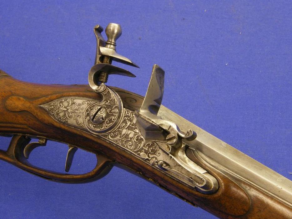 Un fusil muy bonito, austriaco con llave de rueda por Flunck en ST. Polten, sobre 1730, calibre de 14 mm. Estriado, longitud 105 cm, en estado ideal. Para precio preguntar. La llave esta bellamente grabada.