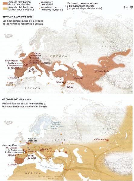 No hace mucho tiempo, aproximadamente unos 45.000 años, un grupo humano que hasta ese momento había evolucionado y habitado únicamente dentro del continente africano alcanza en el desplazamiento migratorio que lleva a cabo a lo largo de multitud de generaciones y miles de años el norte de África y la zona de Oriente Medio (hay que tener en cuenta que en esa época, en plena glaciación de Würn, las tierras del norte de África y Oriente Medio eran mucho más habitables, muy diferentes de lo que son en la actualidad). Son los homo sapiens. Ellos no lo saben, pero antes que ellos, hace ya muchos miles de años, otros grupos humanos con los que comparten un lejano origen común ya habían llegado a estas latitudes. Unos no tuvieron éxito y acabarían extinguiéndose. Pero otros consiguieron establecerse y sobrevivir a duras penas, continuando algunos de ellos su camino hacia Europa y Asia. Los sapiens se encuentran aquí por vez primera con unos humanos de aspecto muy diferente al suyo, el hombre de Neanderthal, cuyos antepasados habían llegado a estos lugares hace ya más de 200.000 años. Esto es así debido a que ambos grupos humanos, que comparten un origen común, llevan evolucionando por separado desde hace miles de años. Los neanderthales no poseen un lenguaje, cultura y socialización tan desarrollado como los de los sapiens. Aunque es algo que no se produce de forma generalizada, se lleva a cabo el cruce entre ambos grupos humanos, intercambiándose material genético. Supongo que lo más lógico sería pensar que el aporte de genes neanderthales a los sapiens se produjo a través de las mujeres sapiens. La población de neanderthales nunca ha sido muy numerosa. Los recien llegados les superan en una proporción de 10 a 1, por lo que al enfrentarse a ellos bien son exterminados por los invasores que les superan ampliamente en número o bien se ven obligados a replegarse y huir. El camino hacia adelante de algunos de estos sapiens continúa y avanzan hacia Asia, entrando en Europa a través de la península de Anatolia y virando hacia el oeste desde las regiones de Asia central . El continente europeo es un lugar frío e inhóspito, con el norte cubierto por una permanente y gruesa capa de hielo. En sus límites existen grandes extensiones de permafrost y tundra. Las montañas están cubiertas de forma permanente por las nieves y los glaciares, y en los duros inviernos, la banquisa llega a aproximarse al norte de la península ibérica. Desde las costas atlánticas, los neanderthales pueden ver habitualmente grandes bloques blancos de hielo viajando a la deriva a través del mar. Los hombres de Neanderthal se hallan distribuídos en varios grupos aislados orográficamente (parece ser que habitaban principalmente en tres zonas) ocupando las zonas esteparias, las tierras en las que sus condiciones de vida les son más benignas y más abundancia de alimento poseen. Este aislamiento de milenios entre estos grupos diferentes de población neanderthal, ha hecho que sean algo diferentes unos de otros. Los sapiens no lo saben, pero como consecuencia de la hibridación que tuvo lugar con los neanderthales de Oriente Medio y Asia su sistema inmune se ha visto reforzado, por lo que ahora tendrán mayores opciones de supervivencia en esta nueva tierra tan inhóspita en la que se adentran, dominada hasta ahora por sus lejanos parientes. Estos, sorprendidos, no pueden contener la marea humana invasora que se abalanza sobre sus tierras. Son demasiados y están muy bien organizados. Colonizan los mejores asentamientos, teniendo los neanderthales que abandonarlos y cedérselos. La competencia por la escasa comida disponible se hace brutal. La hibridación que comenzó cuando ambos grupos tomaron contacto en el norte de África y Oriente Medio continúa produciéndose de forma esporádica. Cuando hay enfrentamientos los neanderthales casi siempre están en desventaja, principalmente por su menor número y porque las armas de los sapiens son más sofisticadas y efectivas. Los neanderthales son cada vez menos y se hallan más dispersos. Ya no habrá vuelta hacia atrás para ellos y en unos pocos miles de años los últimos supervivientes de la especie que se han visto confinados por la presión de los sapiens en la península ibérica se verán abocados a la extinción. Lo único que de ellos logrará perdurar en el tiempo estará dentro de los responsables de su final.