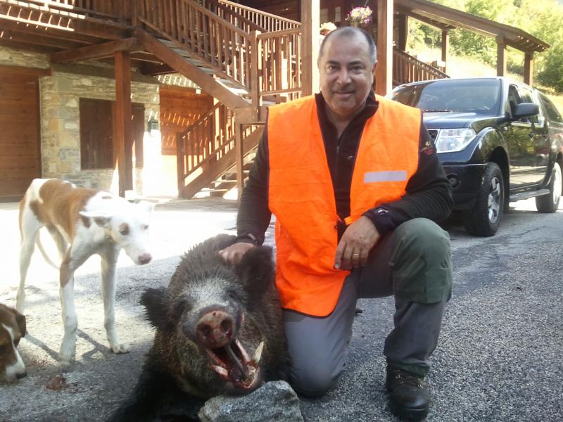 Hola os mando el trofeo del que más satisfecho me siento. Este berraco que tampoco era muy grande, sobre unos 90 kgr lo maté en la Sierra de Guara hace tres temporadas el último día de caza. Tengo un grato recuerdo ya que se lo maté a cuchillo a mis perros y era el primer jabalí que me agarraban mis alanos. Con tan solo 8 meses estaban los dos agarrados del morro del guarro, ayudados por otros podencos y grifones y lo mejor a pesar de las navajas no salió ningún perro herido. Suerte que estaba yo a tan solo 200 metros de donde lo agarraron.
