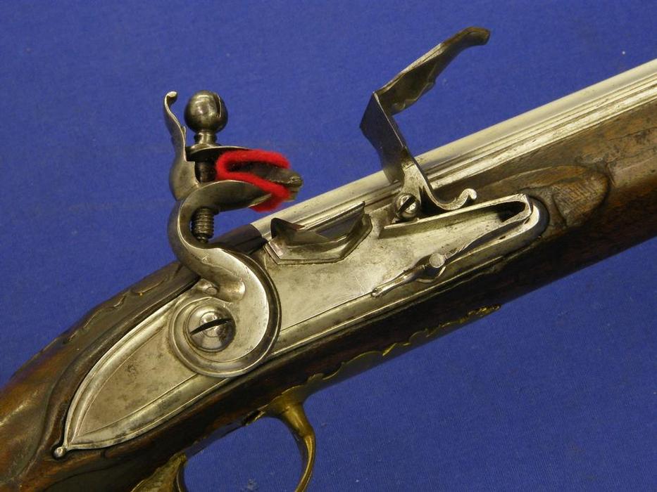 Probablemente este bello fusil de llave de silex sea aleman, con la marca BE coronada marcada en el cañon. El calibre es de 16 mm y el anima lisa. La longitud es de 147 cm y esta muy bien conservado. El precio 2900 euros.