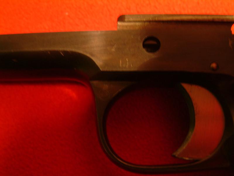 Esa pistola que tienes en tu poder fué fabricada para la Guardia Civil española al terminar nuestra guerra, lo que puedes comprobar por el número de serie y los restos del marcaje que presenta en el lado derecho del armazón, donde puedes ver (casi adivinar :shock: ) lo que aún queda del emblema de la Benemerita en aquellas fechas, compuesto por las letras G y C entrelazadas, con dos fusiles superpuestos a ellas, de los que se puede ver el extremo del cañon de uno por lo menos, y sobre todo esto una corona imperial, de la que tambien se ven unos trazos.