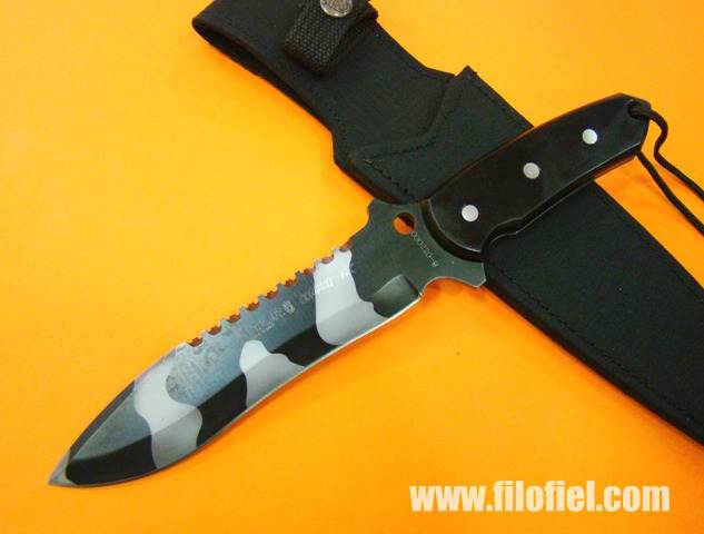 Pues yo, humildemente opino que una pequeña pero efectiva sierra debajo del filo (más cerca del mango), además de no estorbar para nada, sirve de ayuda en muchas situaciones y más aún cuando el filo se ha perdido bastante y no es posible un afilado en condiciones, ya sea en situaciones de supervivencia o de excursión en el monte con la familia.