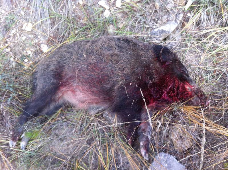 Asoma la jabalina, encaro y le meto el primer tiro al lado de la oreja, pero como seguia vivo a pesar del reguero de sangre que dejaba al bajar, por vicio, le pegué otro en el cogote (que le salió por el cuello), y dejó un charco de sangre justo en el lugar desde el que pego el bote mortal, tras el cual dos garreos y a dormir...